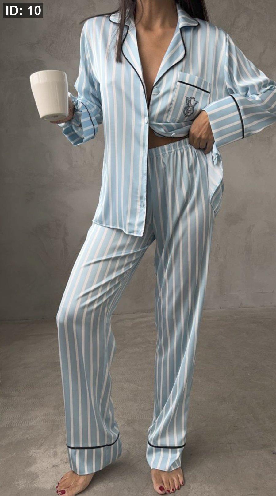 بيجاما victoria secret ستان ناعم لون ازرق مقلم ابيض