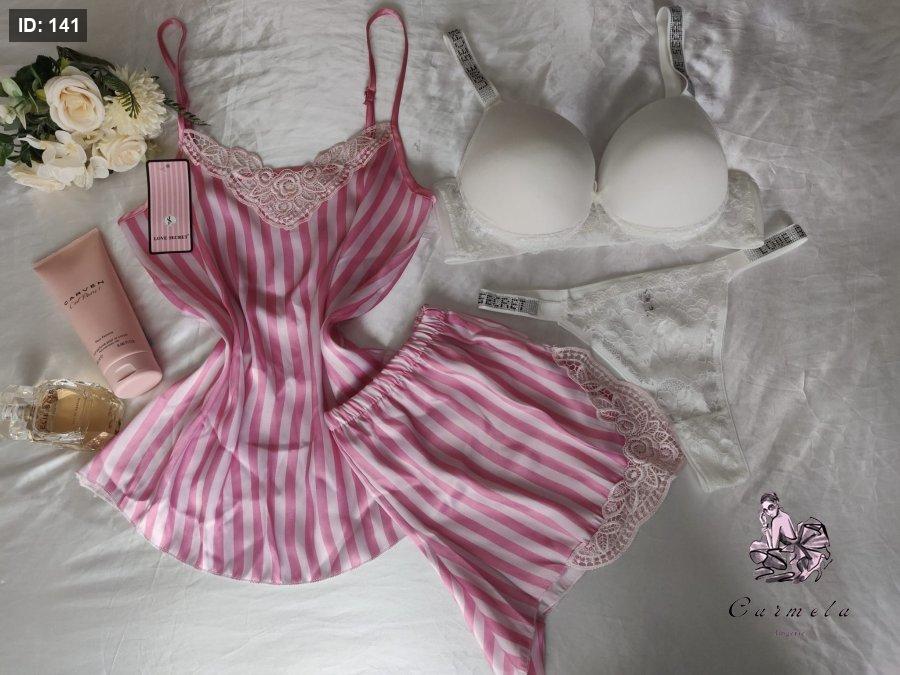 بيجاما ستان ناعم مع دانتيل زهر مقلم