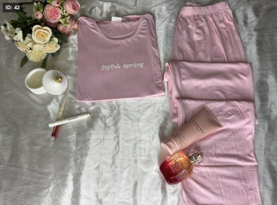بيجاما قطن زبدة لون زهر نقط ابيض نص كم