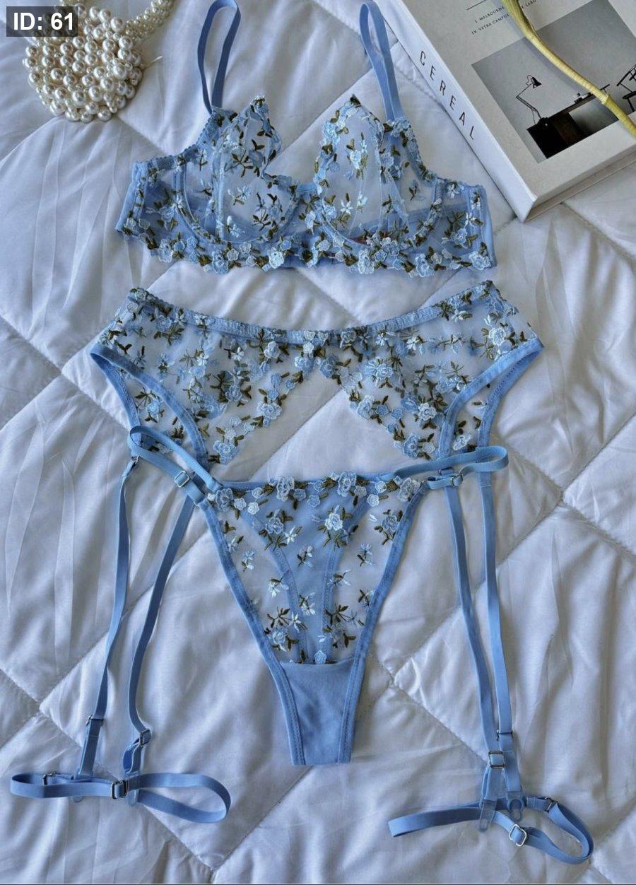 طقم دانتيل مورد ثلاث قطع مع ربطة ازرق