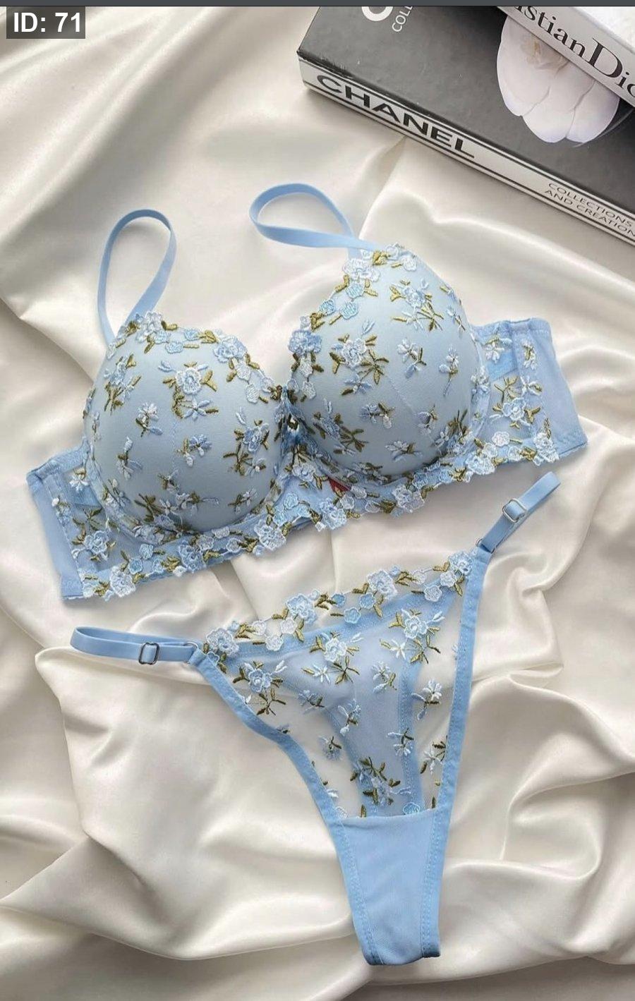 طقم دانتيل ازرق مع ورد اخضر بوش